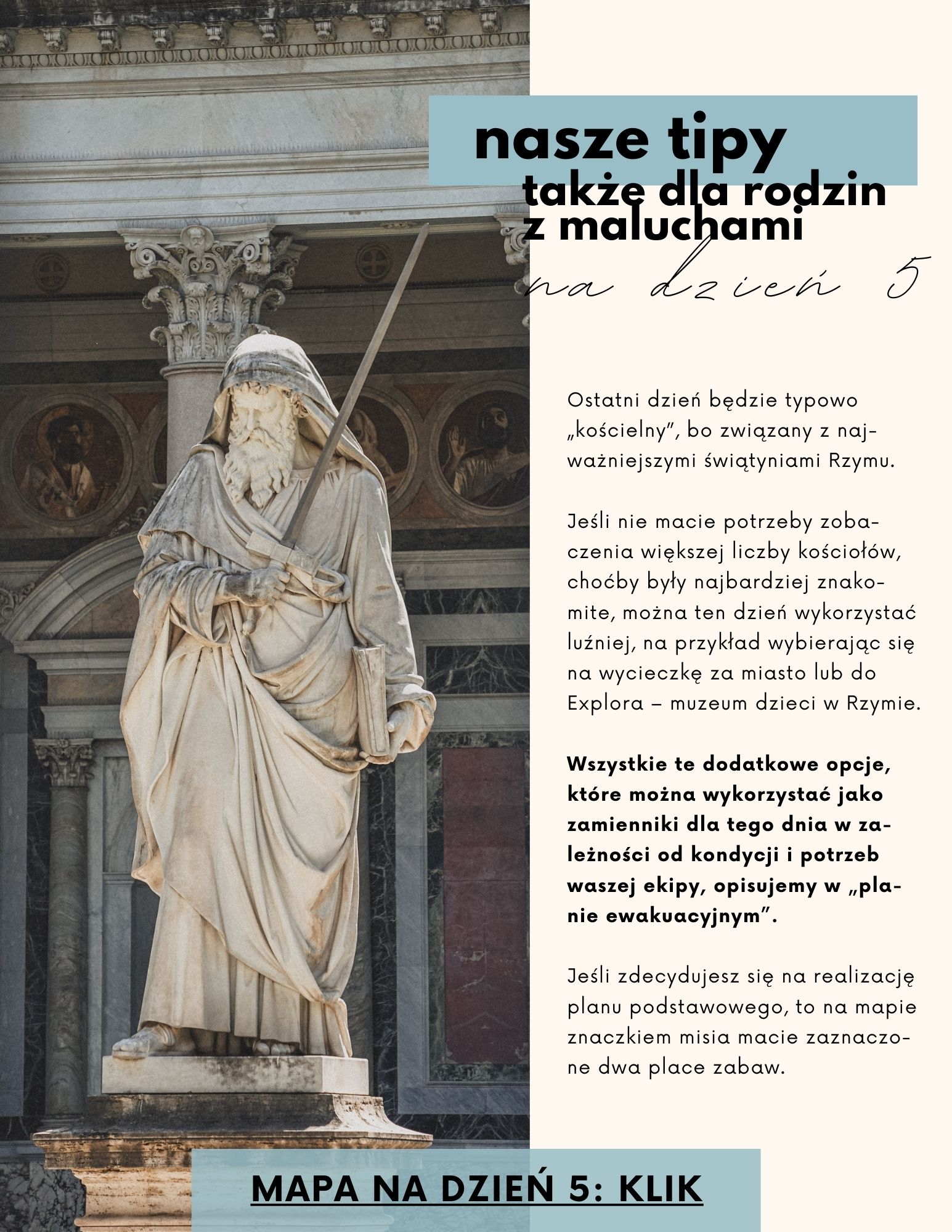 -> klikalne mapy google z trasami na 5 dni (trasa piesza oraz zaznaczone i opisane zabytki, polecane punkty gastro, przystanki na start i na koniec trasy, miejsca dla dzieci) - możesz je zapisać na swoim telefonie,