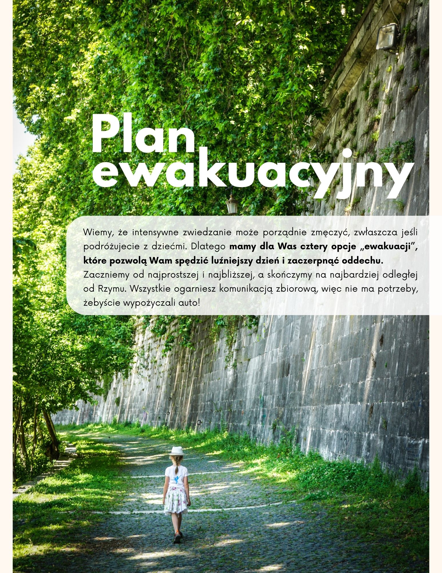 -> masz plan B gdybyście byli zmęczeni zwiedzaniem i potrzebowali przerwy, bo w e-booku dostajesz 4 opcje na "plan ewakuacyjny"- jedno w mieście i trzy poza miastem, ale wszystkie z opcją transportu zbiorowego bez konieczności wynajmu auta!
