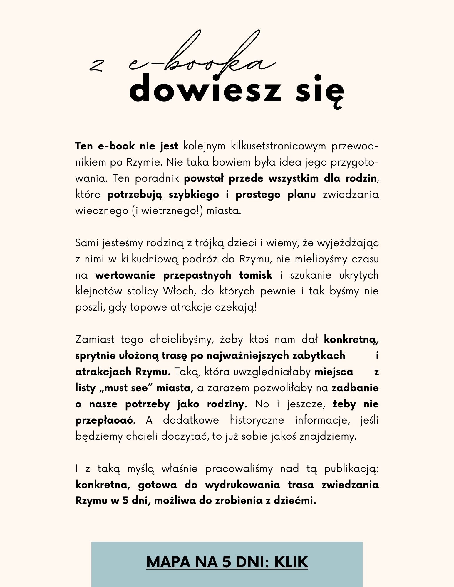 O e-booku: E-book "Rzym w 5 dni dla rodzin" pozwoli Ci zaoszczędzić mnóstwo czasu na planowanie Twojej wymarzonej wyprawy do Rzymu. Kupując go dostajesz gotowy plan na 5 dni, z klikalnymi mapami i wszelkimi możliwymi wskazówkami. Wystarczy kupić bilety i noclegi i jechać, bo plan masz już gotowy.